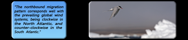 While the migration south to the winter quarters was conducted over a period of three months (average 93 days), the northbound migration back to the breeding sites was much faster. The terns covered the 25,700 km from the winter site north to 60� N in